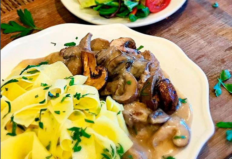 With sherry and sour cream, parslied pappardelle pasta and green goddess salad.  Available hot after 4pm.