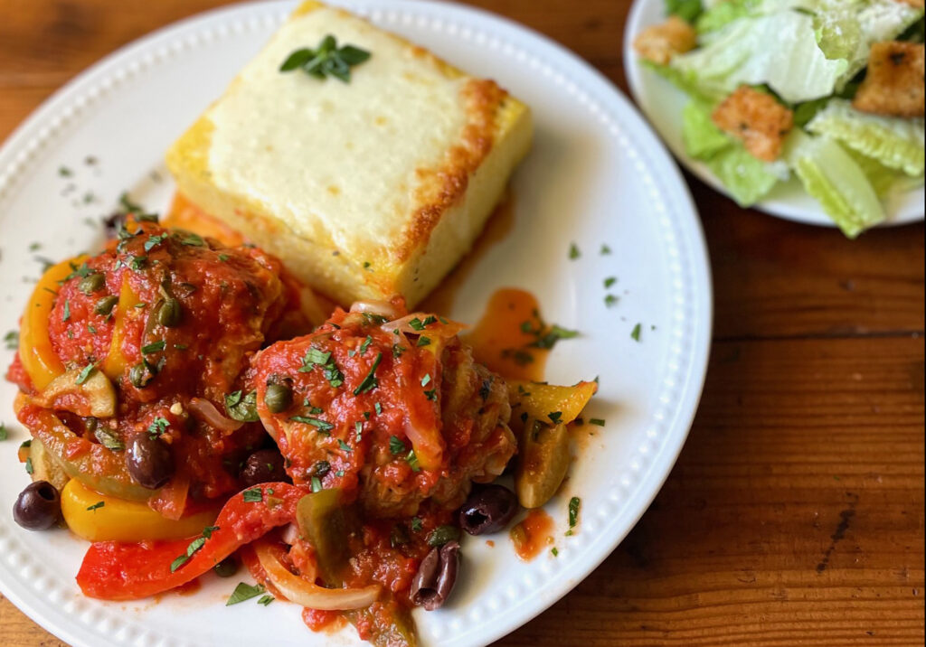 Tomatoes, red wine & olives, cheesy baked polenta and crisp green salad with Italian dressing. Available HOT starting at 4:00 pm.