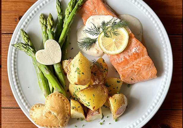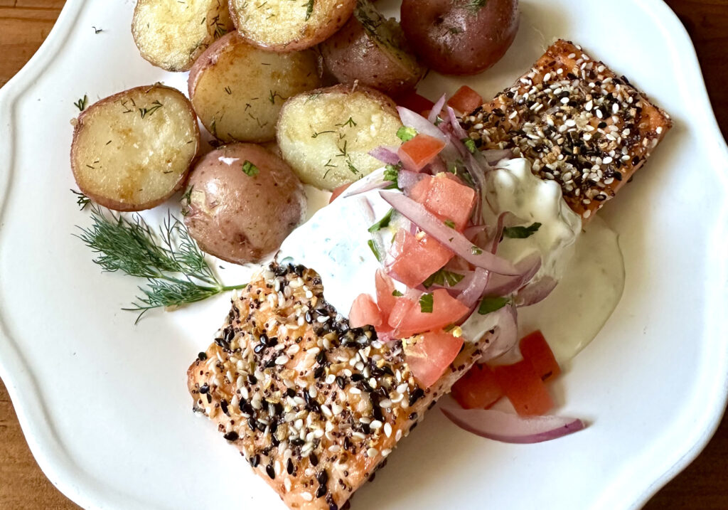 grilled salmon with "everything" bagel seasonings and a lemon caper sauce, dilly new potatoes, and romaine & radicchio salad with mustard vinaigrette. Available HOT at 4pm.